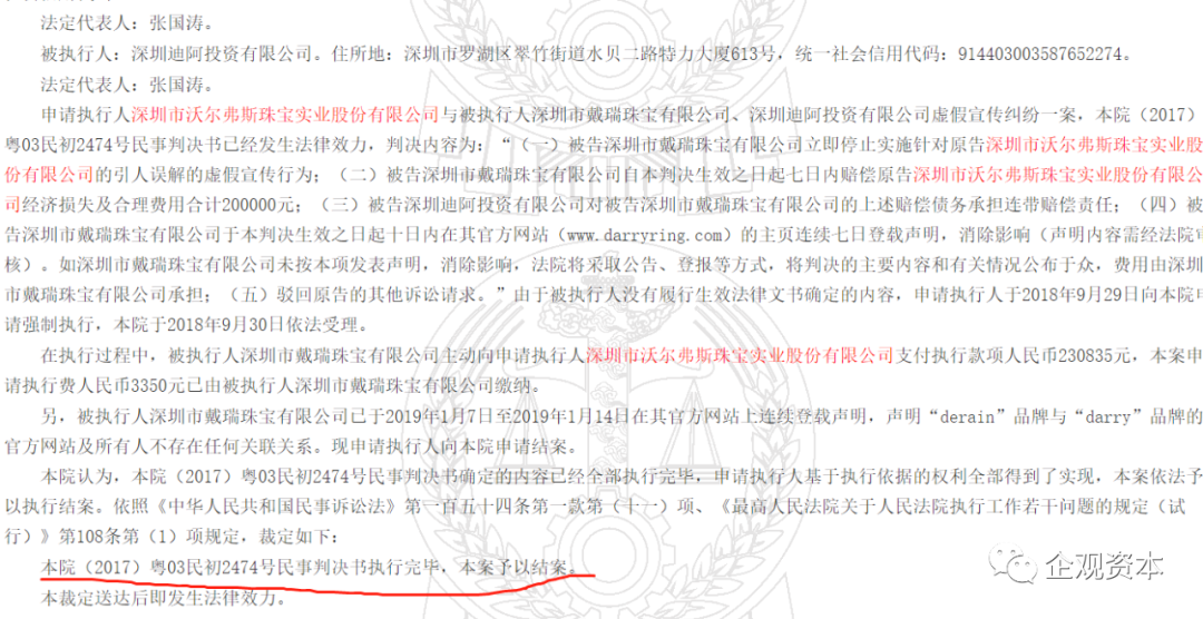 2019年3月26日,中国裁判文书网披露的一份执行裁定书显示,在上述判决中,迪阿股份主动向沃尔弗斯珠宝支付执行款项23.08万元,并在其官方网站(www.darryring.com)于2019年1月7日至2019年1月14日连续登载声明,声明“derain”品牌与“darry”品牌的官方网站及所有人不存在任何关联,消除影响。