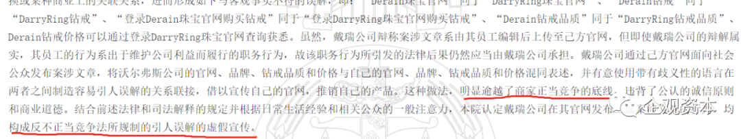 法院判决明确表明,戴瑞公司通过己方官网面向社会公众发布案涉文章,将沃尔弗斯公司的官网、品牌、钻戒品质和价格与自己的官网、品牌、钻戒品质和价格混同表述,并有意使用带有歧义性的语言在两者之间制造容易引人误解的关系联接,借以宣传自己的官网,推销自己的产品。这种做法“明显逾越了商家正当竞争的底线,违背了公认的诚信原则和商业道德。”