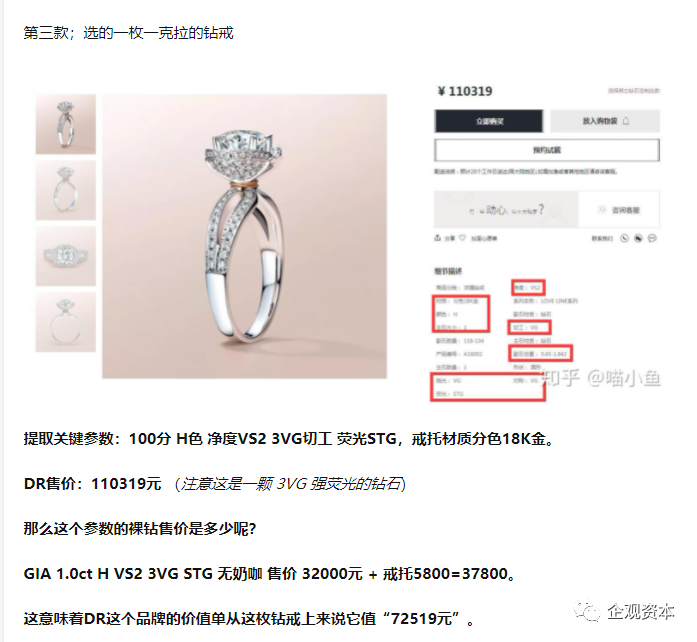 值得注意的是,在社交平台上,知乎用户@喵小鱼曾发帖指出,DR家一款1克拉售价超过11万元的钻戒,同等参数形态下,其裸钻的价格只需37800元,这意味着DR这个品牌的价值,单从这枚钻戒上来说它值“72519元”。知乎用户@喵小鱼的认证身份为:钻石分级师首饰设计师。