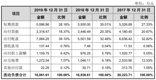其中,短期借款金额分别为2000.00万元、5526.89万元、5930.00万元、5086.86万元,占流动负债的比例分别为10.15%、27.33%、35.01%、28.16%。