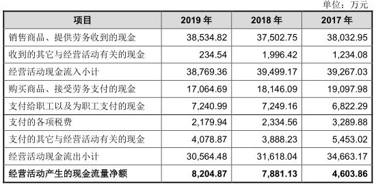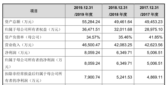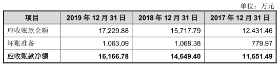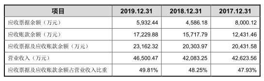 2017年至2019年,公司应收票据及应收账款余额合计分别为2.04亿元、2.03亿元、2.32亿元,占营业收入的比例分别为47.93%、48.25%、49.81%。