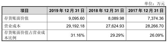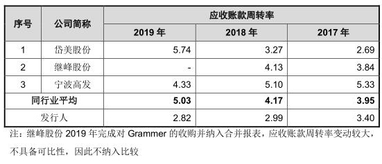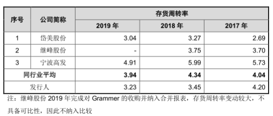 据招股书,2017年度,公司存货周转率较同行业可比公司均值高,2018年及2019年公司存货周转率较同行业可比公司均值低,主要系公司2018年及2019年公司分别增加了原材料及库存商品储备所致。