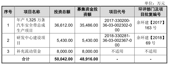 公司称,年产1325万条汽车安全带总成生产项目计划在稳固现有汽车安全带总成销售的基础之上,升级产品结构,推广双边预张紧限力式安全带,加快汽车安全带总成的开发与生产,满足客户需求,以进一步扩大市场份额,提升公司综合竞争实力。