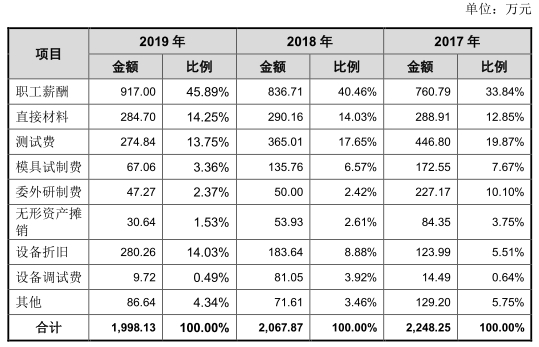 报告期内,公司研发费用主要由职工薪酬、直接材料等费用构成。其中,职工薪酬分别为544.36万元、760.79万元、836.71万元、917.00万元,占研发费用的比例分别为26.89%、33.84%、40.46%、45.89%。