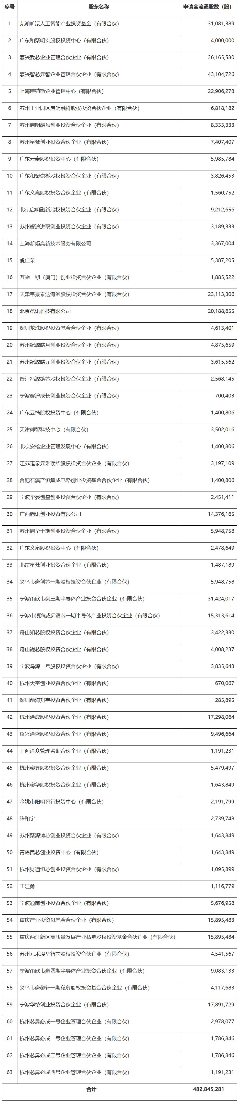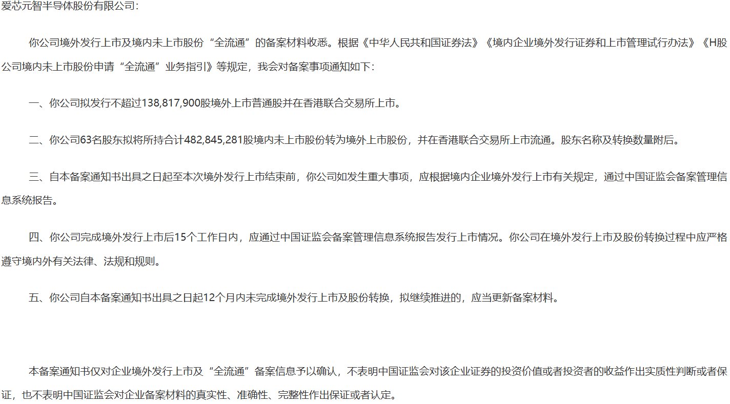 1月28日,中国证监会国际合作司发布《关于爱芯元智半导体股份有限公司境外发行上市及境内未上市股份“全流通”备案通知书》。公司拟发行不超过138,817,900股境外上市普通股并在香港联合交易所上市。公司63名股东拟将所持合计482,845,281股境内未上市股份转为境外上市股份,并在香港联合交易所上市流通。