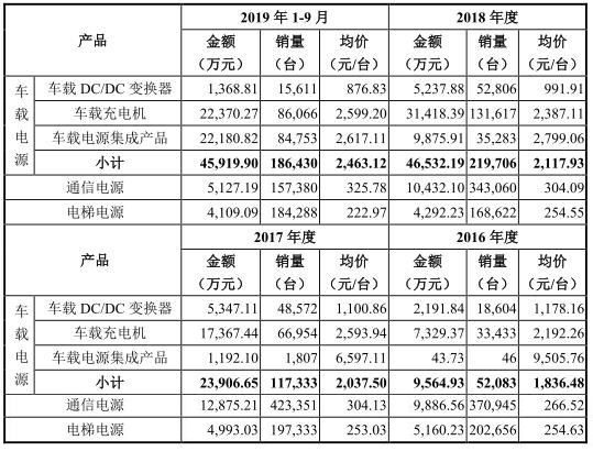 报告期内,公司车载电源集成产品均价分别为9505.76元/台、6597.11元/台、2799.06元/台、2617.11元/台。