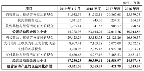 2016年至2019年1-9月,威迈斯实现营业收入分别为2.57亿元、4.25亿元、6.16亿元、5.70亿元,实现归属于母公司所有者的净利润分别为2434.67万元、1635.34万元、6852.26万元、5744.29万元。公司经营活动产生的现金流量净额分别为1345.09万元、421.79万元、3065.09万元、-3021.30万元,其中,销售商品、提供劳务收到的现金分别为2.54亿元、3.09亿元、5.17亿元、4.19亿元。