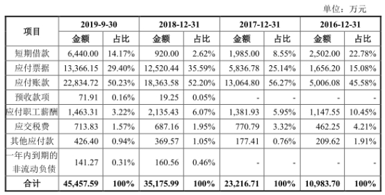报告期内,公司短期借款金额分别为2502.00万元、1985.00万元、920.00万元、6440.00万元;应付账款金额分别为5006.08万元、1.31亿元、1.84亿元、2.28亿元。