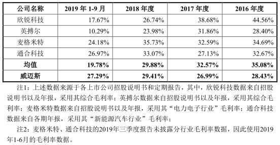 威迈斯3年毛利率低于行业平均水平。2016年至2019年1-9月,威迈斯综合毛利率分别为29.07%、27.62%、29.53%和28.40%,主营业务毛利率分别为28.43%、26.99%、29.41%和27.29%。2016年至2018年,威迈斯毛利率低于同行业公司毛利率均值35.08%、32.57%、29.88%。