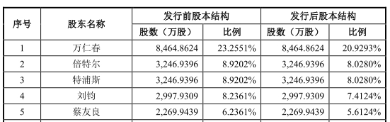 公司控股股东及实际控制人为万仁春。万仁春直接持有公司8464.8624万股,占公司总股本的23.2551%,为公司的控股股东。此外,万仁春通过控制倍特尔、特浦斯、森特尔三个员工持股平台,间接控制公司22.2838%的股权。因此,万仁春直接和间接控制公司45.5389%的股权。