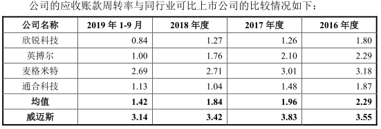 2016年至2019年9月30日,威迈斯应收账款余额分别为7245.70万元、1.50亿元、2.11亿元、3.16亿元,占营业收入比例分别为28.20%、35.23%、34.22%、38.17%。公司应收账款周转率先升后降,分别为3.55、3.83、3.42、3.14,高于同行业可比上市公司应收账款周转率平均值2.29、1.96、1.84、1.42。