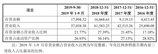 2016年至2019年9月30日,威迈斯存货金额分别为4413.45万元、9119.15万元、1.69亿元、1.80亿元,占营业收入比例分别为17.18%、21.45%、27.39%、21.77%。