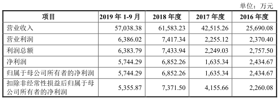 2016年至2019年1-9月,威迈斯实现营业收入分别为2.57亿元、4.25亿元、6.16亿元、5.70亿元,实现归属于母公司所有者的净利润分别为2434.67万元、1635.34万元、6852.26万元、5744.29万元。