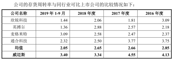 2016年至2019年9月30日,威迈斯存货金额分别为4413.45万元、9119.15万元、1.69亿元、1.80亿元,占营业收入比例分别为17.18%、21.45%、27.39%、21.77%。公司存货周转率分别为4.13、4.55、3.34、3.40,与同行业可比上市公司存货周转率平均值分别为2.85、2.66、2.65、2.05。