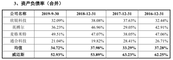 2016年至2019年9月30日,威迈斯负债总额分别为1.18亿元、2.44亿元、3.69亿元、4.83亿元,资产负债率分别为62.25%、63.23%、53.89%、52.93%,高于同行业可比上市公司均值37.28%、33.29%、37.98%、34.72%。