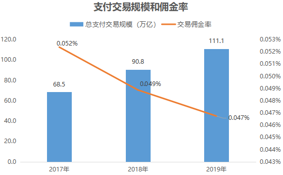 2019年,支付宝平台处理的交易规模达到111万亿元,佣金率(数字支付和商家服务收入除以交易规模)为0.047%。