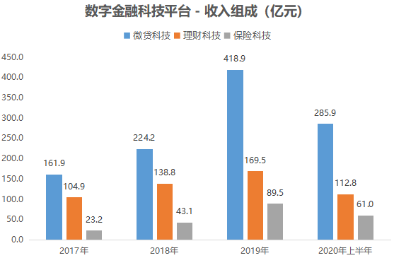 2020年上半年,这三部分业务营收占比分别为36%、63%和1%。从近年的趋势来看,数字金融科技平台业务的增速最高。