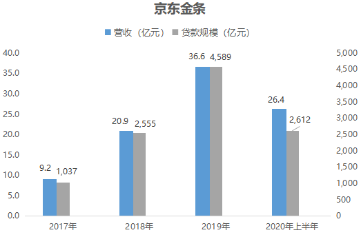 其中,增速最快的为微贷科技,主要产品为花呗和借呗,即对标京东白条和京东金条。