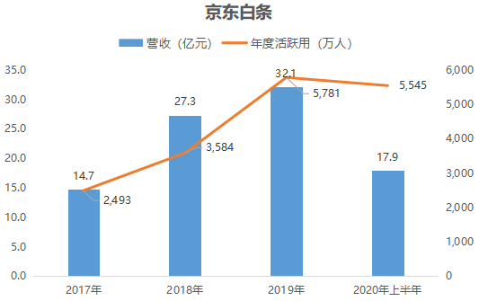 截止2020年上半年,京东白条的年度活跃用户数分别为5,545万人,年复合增长率达 52%,而于2017至2019年间,白条营收的复合增长率达到48%。