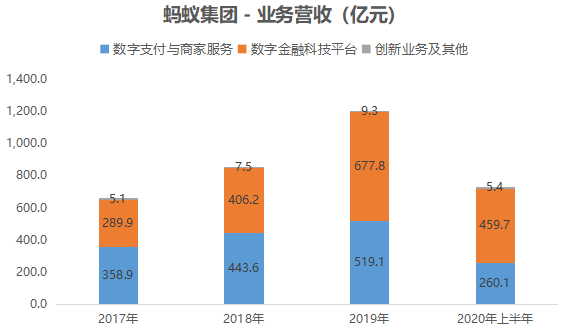 蚂蚁目前拥有三大主业:数字支付及商户服务、数字金融科技平台,以及创新业务。