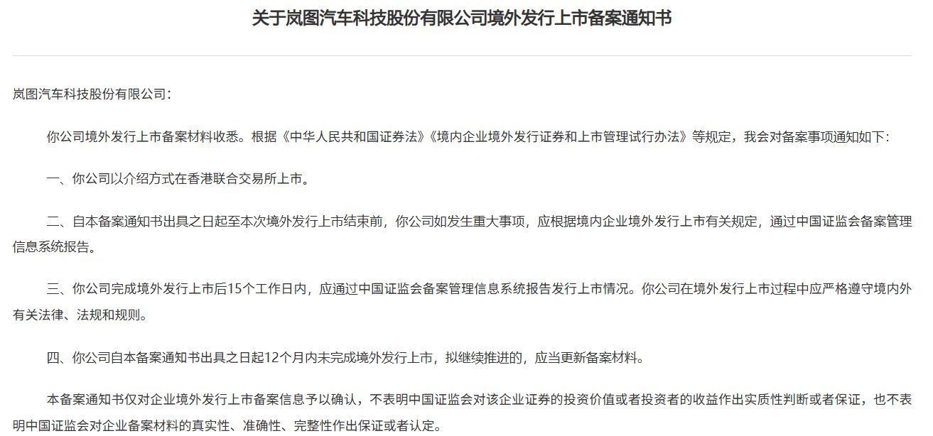 1月28日,中国证监会国际合作司发布《关于岚图汽车科技股份有限公司境外发行上市备案通知书》。岚图汽车拟以介绍方式在香港联合交易所上市。自备案通知书出具之日起12个月内未完成境外发行上市,拟继续推进的,应当更新备案材料。