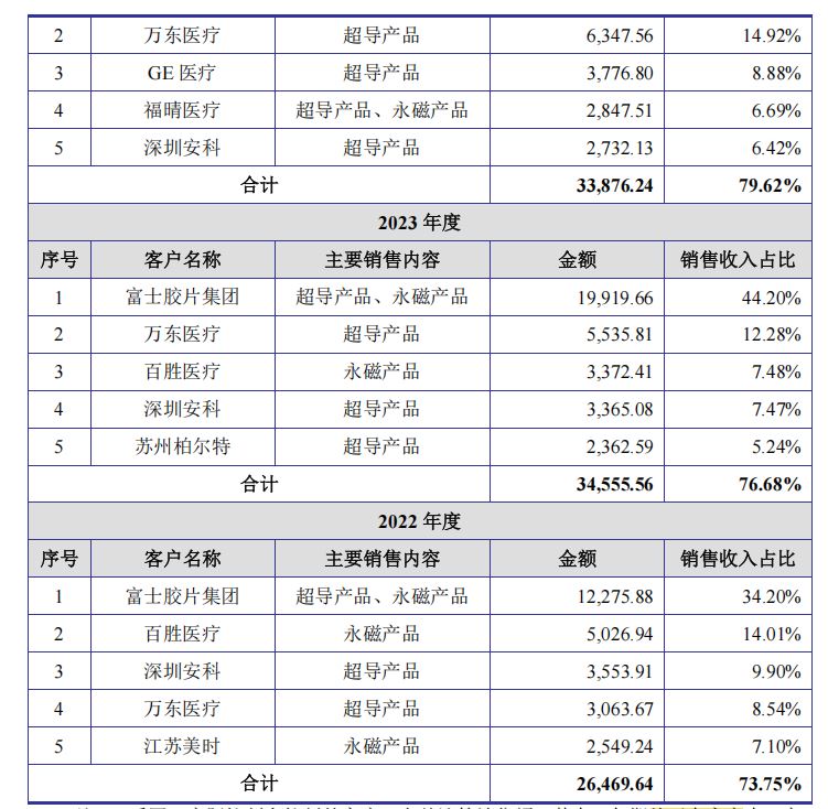 健信超导的客户集中度高到令人窒息——前五大客户贡献近80%营收,第一大客户富士胶片集团占比超40%。