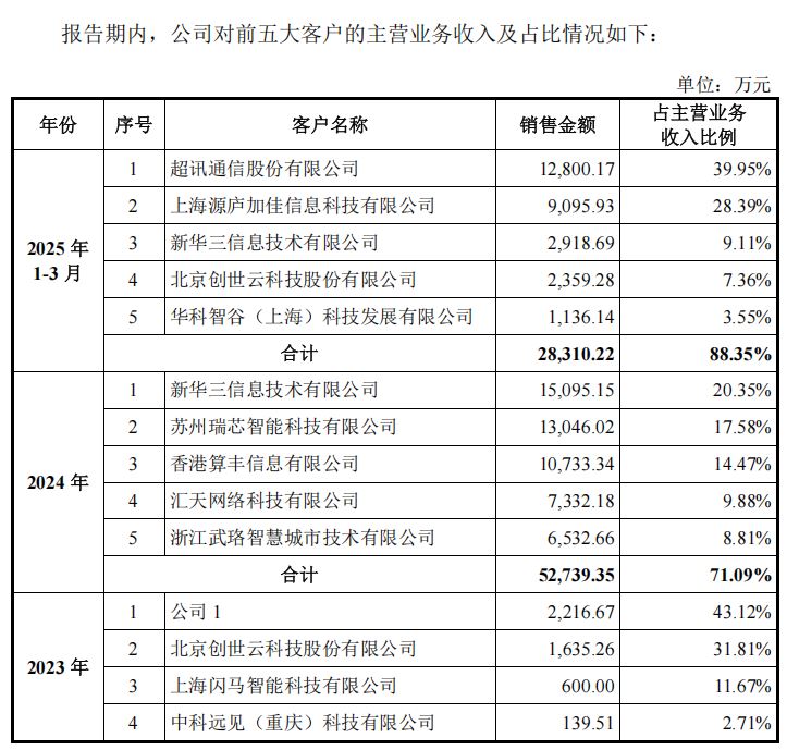 更值得关注的是客户集中度较高的风险。2023年至2025年一季度,公司前五大客户销售金额占当期主营业务收入的比例分别为91.58%、71.09%和88.35%,远高于行业平均水平。