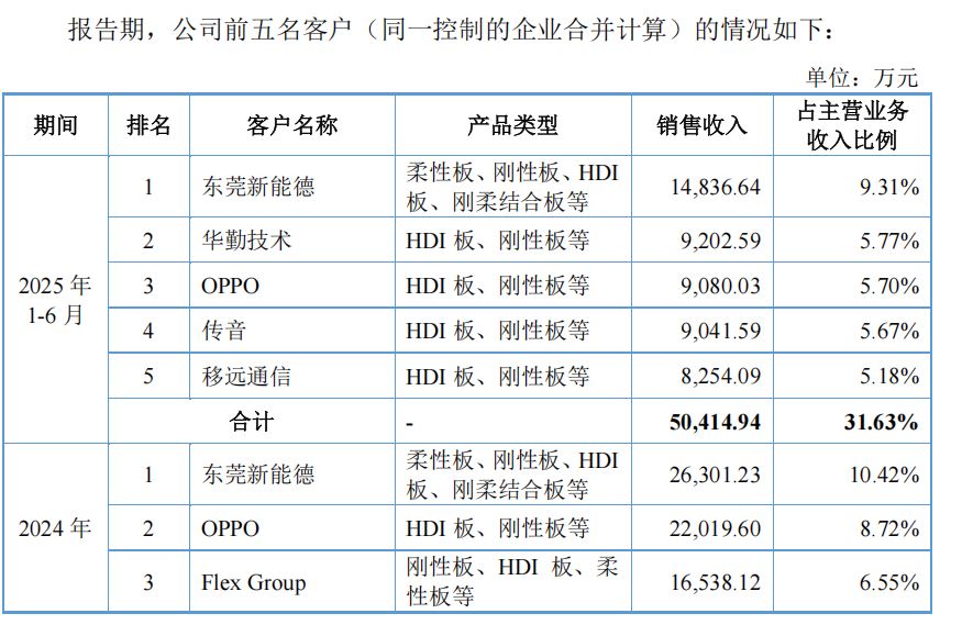 红板科技下游应用领域集中于消费电子和汽车电子,主要客户包括东莞新能德、OPPO、伟创力等。报告期内,公司向前五大客户的销售收入占比分别为44.29%、41.29%、36.71%和31.63%,客户集中度较高。尽管公司称与主要客户合作稳定,但若大客户生产经营波动或采购量减少,将对公司订单造成显著影响。
