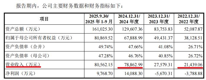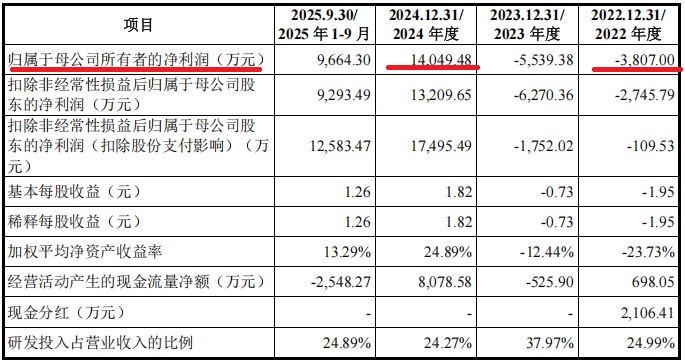 2022年至2024年,公司营业收入从2.14亿元增长至7.89亿元。同期,归母净利润从-3807.00万元扭亏为盈至1.40亿元。2025年前三季度,公司实现营收8.06亿元,归母净利润9664.30万元。