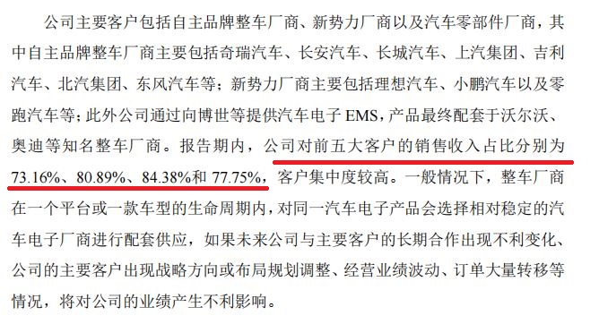 埃泰克对前五大客户的销售收入占比近年来已增至84.38%,其中对奇瑞汽车的销售收入占比已超过五成。