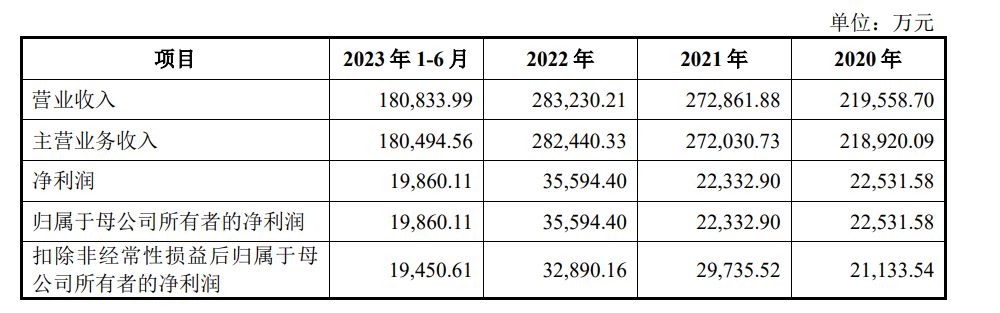 业绩方面,2020年-2022年及2023年1-6月,儒兴科技实现营业收入分别为21.96亿元、27.29亿元、28.32亿元、18.08亿元;归属于母公司所有者的净利润分别为2.25亿元、2.23亿元、3.56亿元、1.99亿元。