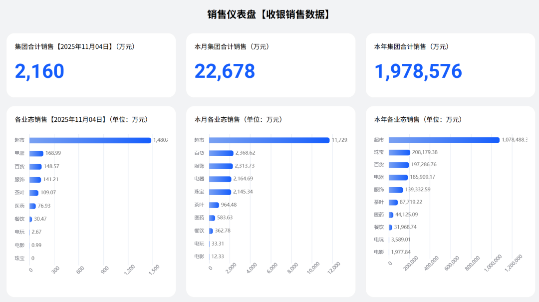 经营业态涵盖超市、百货、电器、服饰、餐饮、医药、珠宝、茶叶、电影、电玩、图书、眼镜。截至2025年1月员工人数约 8300人,共安排就业人数约18000人。2024年销售总金额近170亿元,纳税金额6亿多元,利润8亿多元,员工平均月收入9000元。