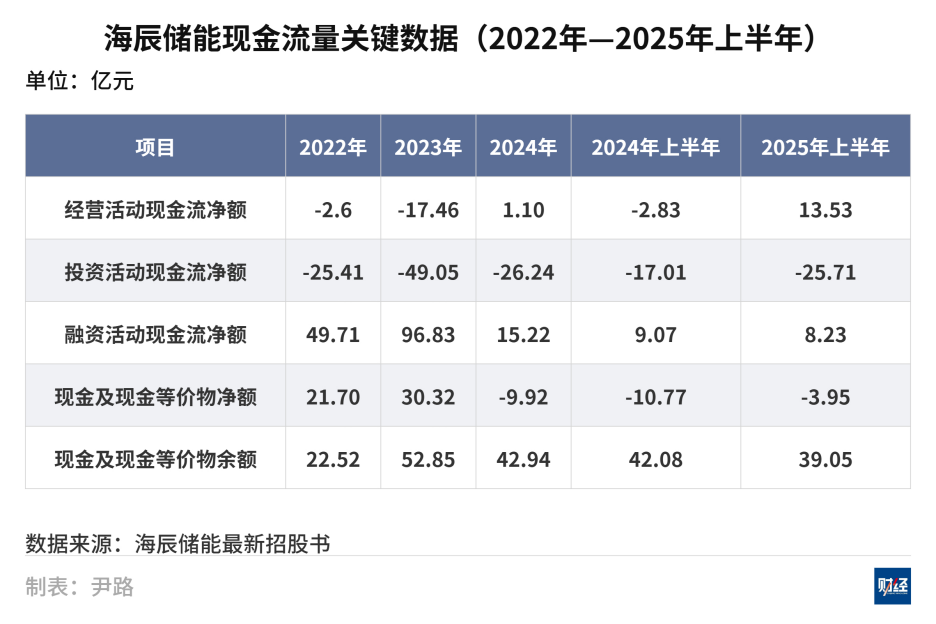 海辰储能本次更新的招股书补充了2025年上半年的财务及运营数据,反映了今年全球储能市场的高增长对公司业务的拉动。2025年上半年,海辰储能的营业收入同比增长224.6%,体现了迅速增长的业务规模。但细观其财务表现,持续为负的经营现金流反映了公司在扩张过程中存在的资金压力与结构性风险。