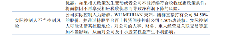 股权结构显示,陆群直接持有公司94.5%的股份,并通过持股平台百十投资间接控制4.5%的表决权。陆群任公司董事长兼总经理,WUMEIJUAN任公司董事。