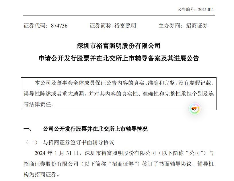 裕富照明(874736.NQ)近日发布公告称,公司已向深圳证监局申请将辅导备案板块从深交所创业板变更为北交所。