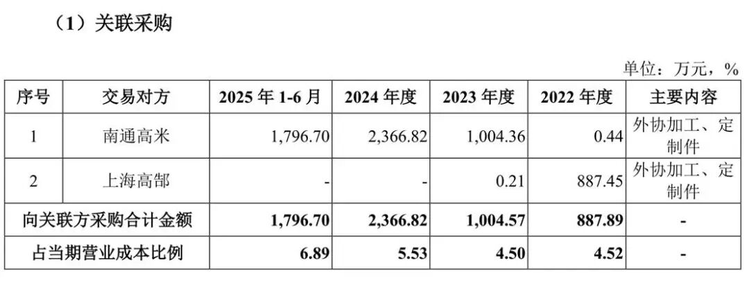 托伦斯的主要供应商中,存在公司关联方。2022年-2025年上半年,南通高米位列托伦斯第五、第二、第三及第三大供应商,托伦斯各期向其采购金额分别为887.89万元、1,004.57万元、2,366.82万元和1,796.7万元(合并口径,南通高米指南通高米及高郜精密)。