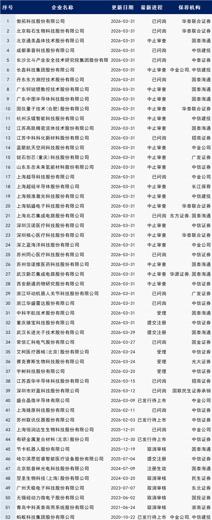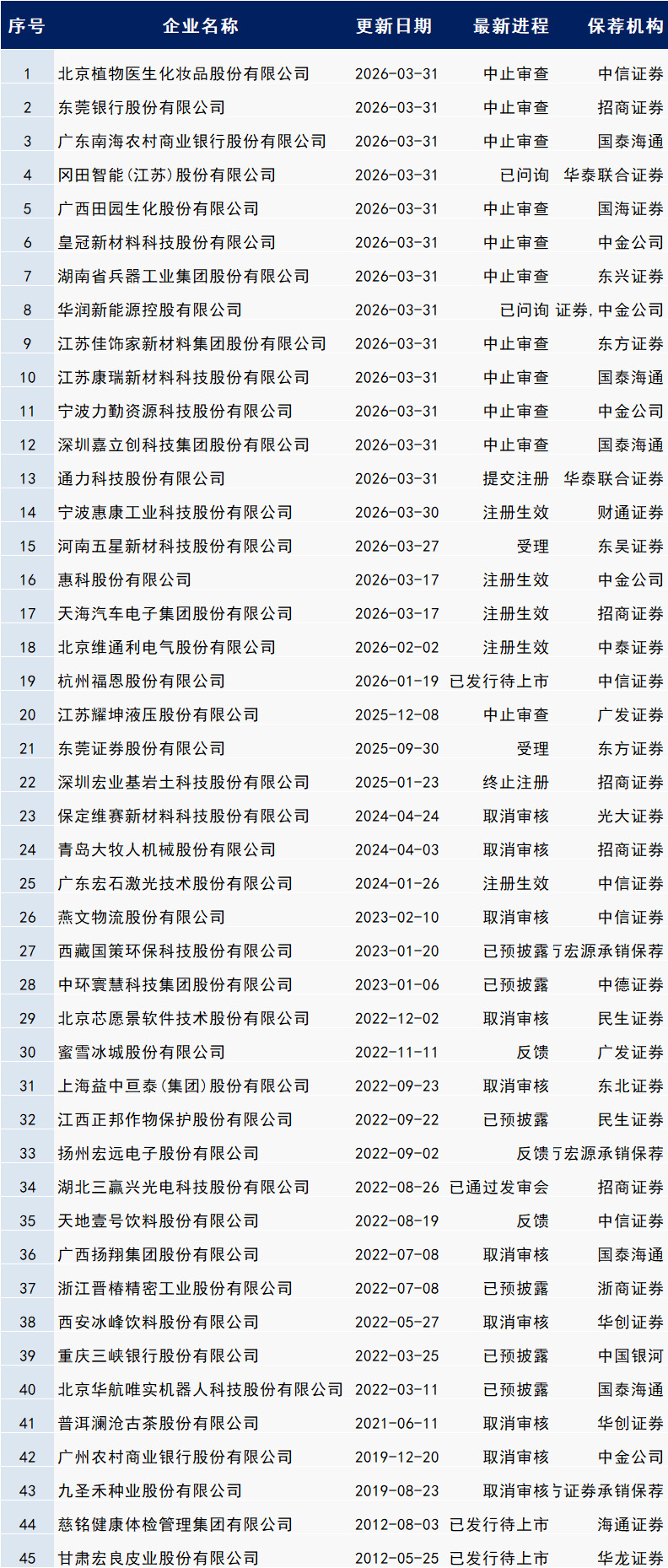 部分进程暂未列入,如有需要可留言:已过会、已上市、终止审查、不予核准、不予注册、终止注册。