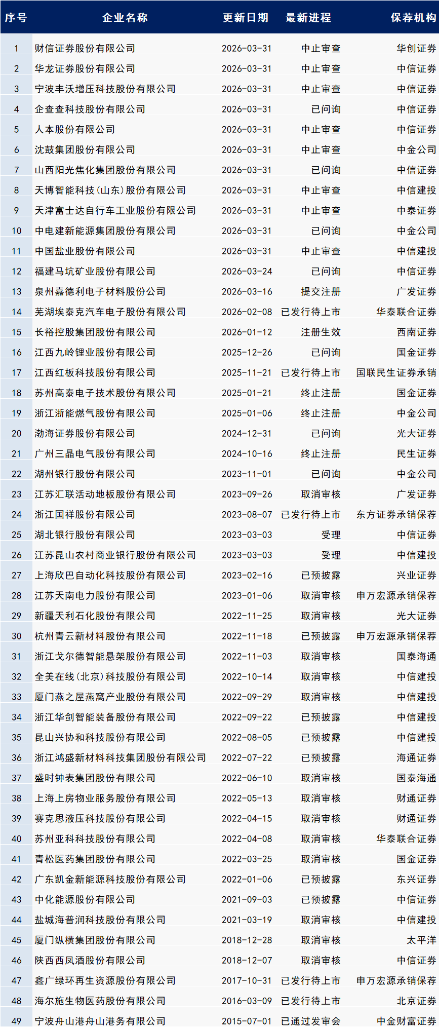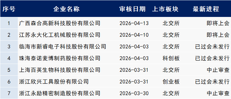 以下最新IPO进程中包含:已预披露、受理、已问询、已发行待上市、暂缓表决、中止审查、反馈、已通过发审会、提交注册、注册生效。