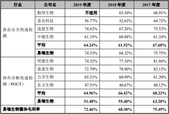 根据招股说明书,2017年至2019年,易瑞生物主营业务为食品安全精准快速检测产品的研发、生产、销售及相关服务,并向体外诊断快速检测(POCT)领域拓展。由于两个领域均存在同行业可比公司,因而可将毛利率和相关领域的可比公司进行对比。
