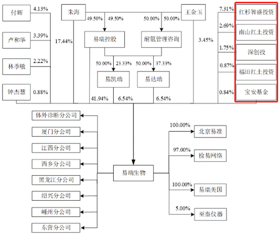 深圳市易瑞控股有限公司直接持有易瑞生物1.51亿股股份,持股比例为41.94%,系易瑞生物的控股股东。易瑞生物的实际控制人为朱海、王金玉夫妇,二人合计控制易瑞生物股份(26.480, -0.62, -2.29%)2.62亿股,占总股本的比例为72.86%。