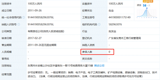 易瑞生物2017年第二大供应商东莞市智邦电子有限公司社保缴纳人数为0人。