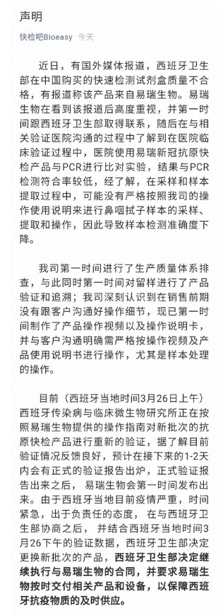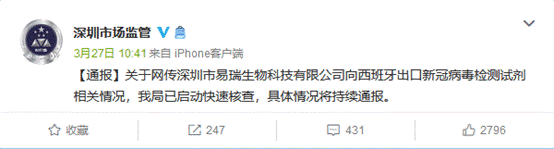 3月27日,深圳市市场监督管理局发布消息称,关于网传易瑞生物向西班牙出口新冠病毒检测试剂相关情况,已启动快速核查,具体情况将持续通报。同日,易瑞生物在其官网发布声明称,假阴性的出现不排除因验证时的操作流程、病人病历、采样等事项导致结果偏差的可能。