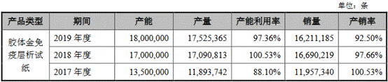2016年至2019年,易瑞生物胶体金免疫层析试纸产能分别为891万条、1350万条、1700万条和1800万条,产量分别为817.37万条、1189.37万条、1709.08万条和1752.54万条,销量分别为666.98万条、1195.73万条、1669.02万条和1621.12万条,产能利用率分别为91.74%、88.10%、100.53%和97.36%,产销率分别为81.60%、100.53%、97.66%和92.50%。
