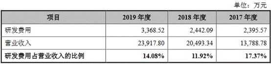 2016年至2019年,易瑞生物研发费用分别为1690.47万元、2395.57万元、2442.09万元和3368.52万元,占营业收入的比例分别为19.42%、17.37%、11.92%和14.08%。