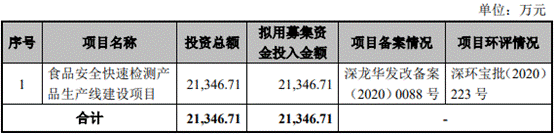 根据募资规划,易瑞生物拟使用2.13亿元募集资金用于食品安全快速检测产品生产线建设项目,该公司并未列出具体产能新增情况,仅在招股说明书中表示,项目建成后,食品安全检测产品的生产能力将大幅增加,新增营收2.06亿元。