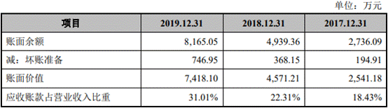 过去四年,该公司坏账准备分别为94.48万元、194.91万元、368.15万元和746.95万元;应收账款账面价值分别为1570.56万元、2541.18万元、4571.21 万元和7418.10万元,占营业收入的比重分别为18.04%、18.43%、22.31%和31.01%。