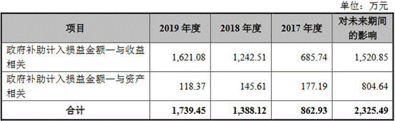 根据招股说明书,2016年至2019年,易瑞生物计入当期损益的政府补助分别为1141.30万元、862.94万元、1388.12万元和1739.46万元,占报告期内归属于母公司所有者的非经常损益的138.55%、208.03%、118.79%和104.87%。