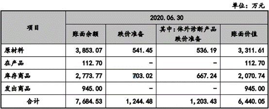 2020年上半年,易瑞生物存货跌价准备为1244.48万元,其中体外诊断产品跌价准备1203.43万元,体外诊断产品原材料跌价准备为536.19万元,库存体外诊断产品跌价准备为667.24万元。