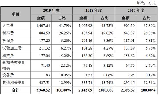 易瑞生物研发费用主要为人工费、材料费和试验加工费,上述三项在报告期内占研发费用的比重合计为70.42%、67.82%和74.32%,为该公司主要研发费用支出。