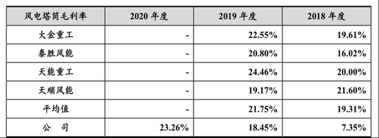 此外,《投资时报》研究员注意到,报告期内,该公司综合毛利率分别为16.71%、24.01%、24.48%,尽管呈逐年递增趋势,但整体仍低于同行业上市公司的平均水平。特别是风电塔筒毛利率,2018年该公司风电塔筒毛利率仅为7.35%,远低于行业该项指标均值19.31%。2019年,此项数据虽增加至18.45%,但仍不及行业21.75%的平均数值。